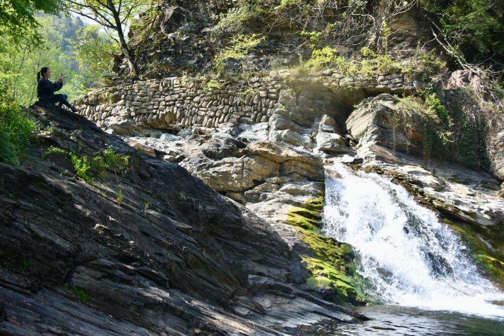 一名游人坐在汉水源村村口的瀑布旁观景。