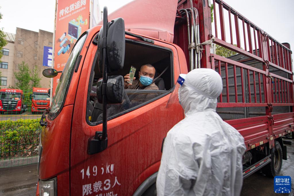 4月13日,工作人员查验驶入杭州传化公路港的货车司机健康码。