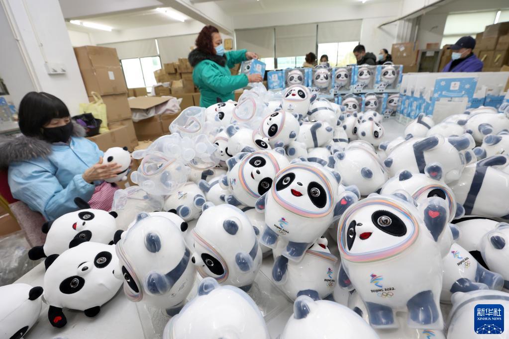 2月8日,工人在位于江苏省启东市的一家特许生产商的车间里包装“冰墩墩”。