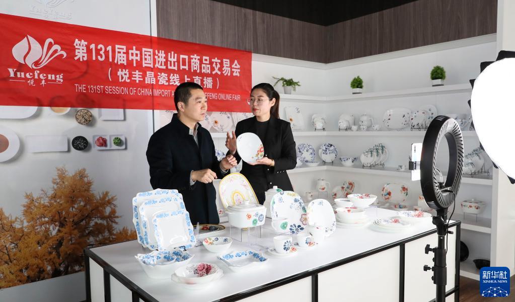 4月15日,第131届中国进出口商品交易会线上开幕。在江苏省淮安市洪泽区,一家陶瓷企业的工作人员在展厅直播介绍产品。