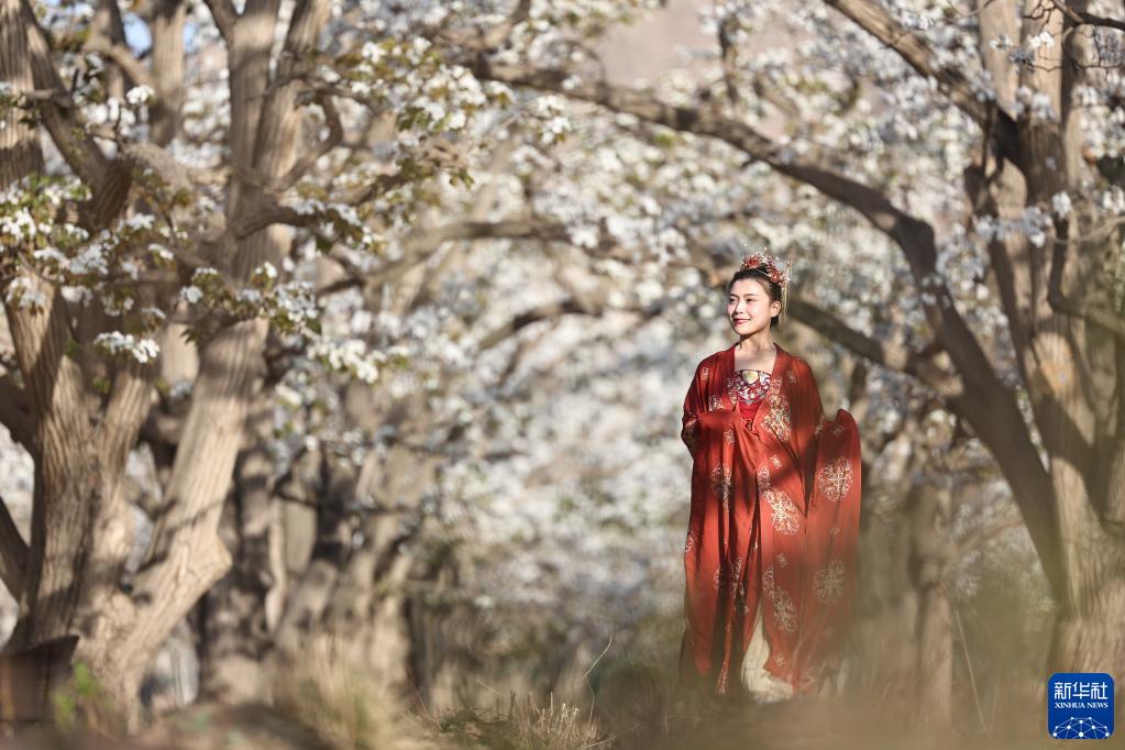 4月7日,景区工作人员在甘肃省兰州市皋兰县什川镇百年梨园内进行表演。受疫情影响,景区组织工作人员在梨园内直播,邀请人们“云赏花”,满足公众赏花需求。
