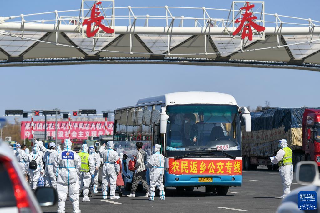 在吉林长春高速公路东出口,返乡农民登上返乡公交专线(4月12日摄)。