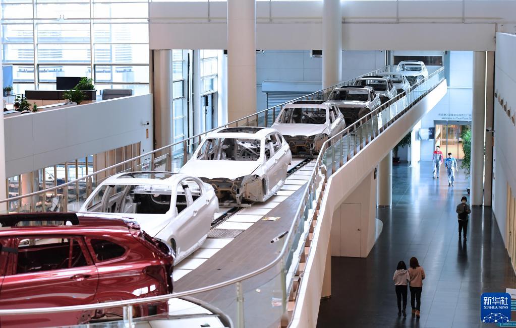 2月16日,在华晨宝马沈阳铁西工厂,生产中的车辆穿过办公区。