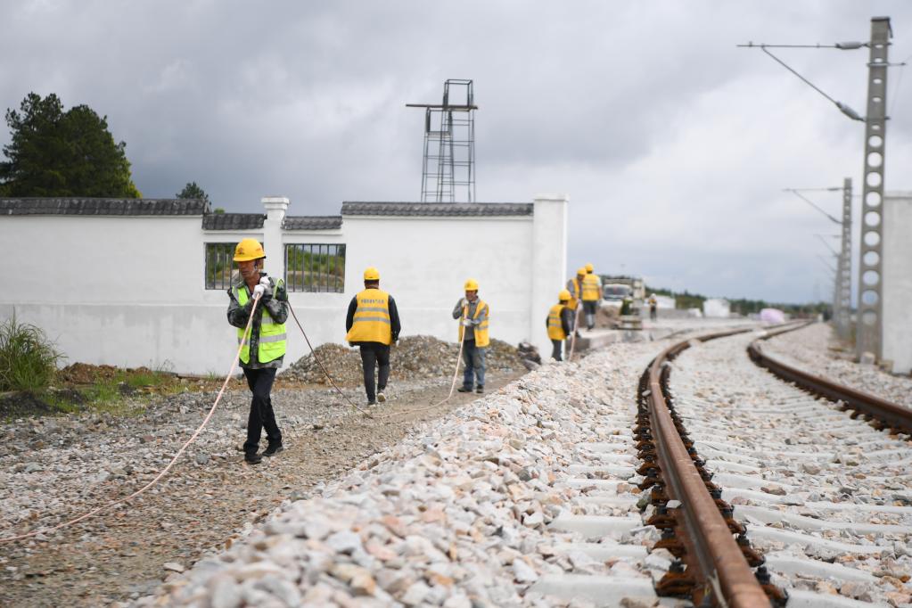 4月13日,工人在湖南省浏阳市浩吉铁路沿线施工。