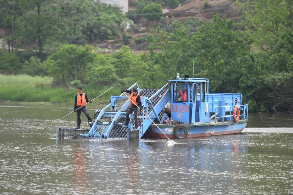 4月14日,工作人员在湖南省醴陵市渌水之上打捞杂草、垃圾等。