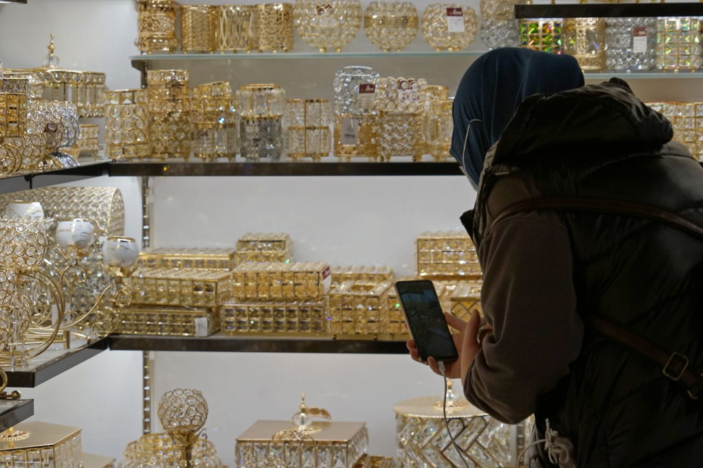 义乌国际商贸城一家水晶商铺内,业务员小丁正在货架前进行远程视频连线,手机的另一头连着巴勒斯坦。受疫情影响,海外客商来华不便,远程直播成为其采购之“眼睛”。“客户担心这个灯台尺寸比较大,运费会不会比较贵?”业务员小丁问。“没问题,主体和灯座可以拆卸,包装不占空间。”商铺负责人刘荣斌立即回复。