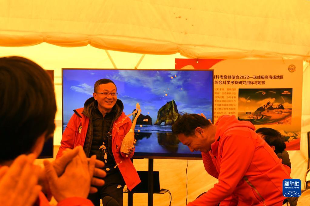 在珠峰脚下海拔5200米的总指挥会议室帐篷里,大家热烈庆祝“巅峰使命”珠峰科考登顶观测采样成功(5月4日摄)。