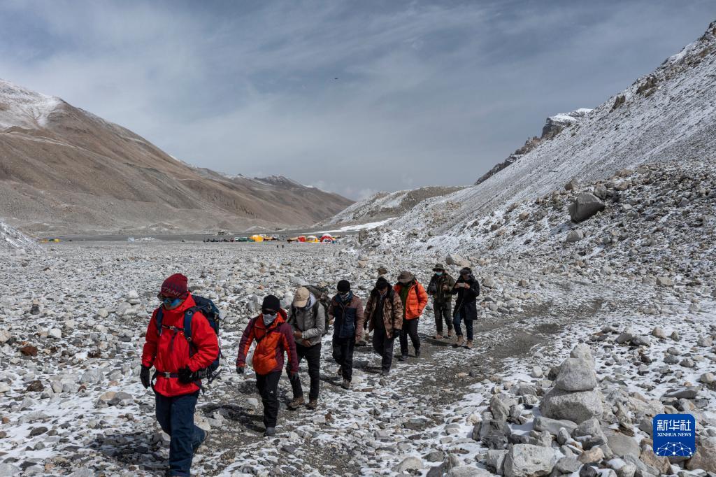 朱彤(右一)和科研人员在珠峰大本营和东绒布冰川间徒步穿梭(5月1日摄)。