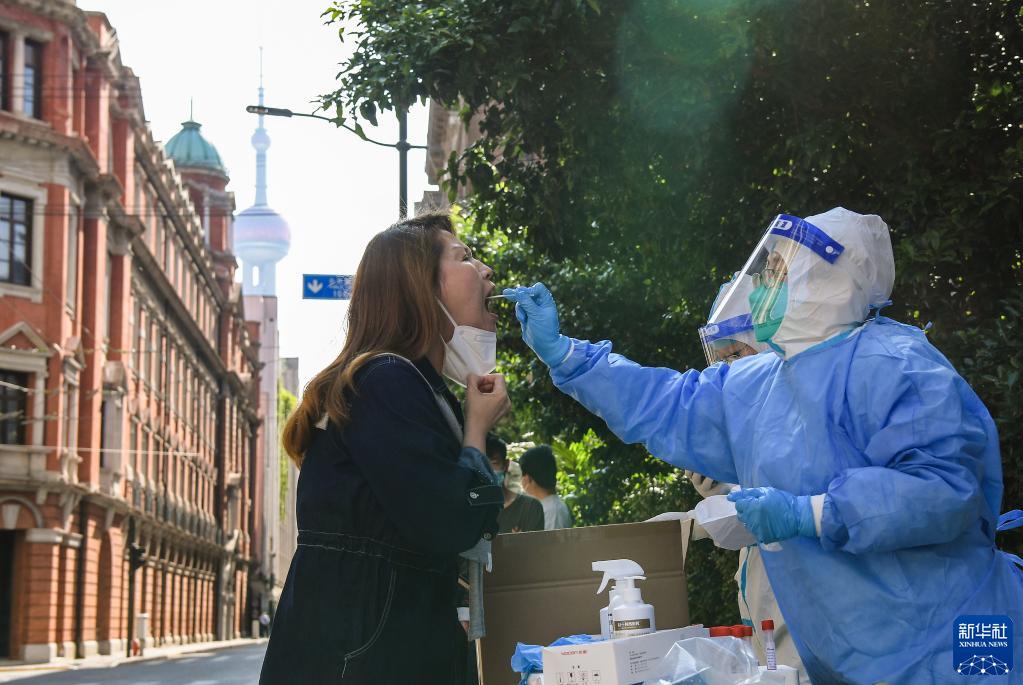 居民在上海市黄浦区核酸筛查点接受采样(5月7日摄)。