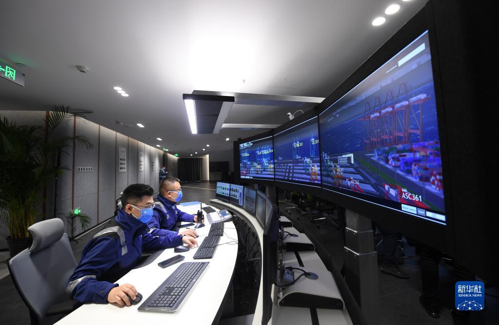 工作人员在天津港北疆港区C段智能化集装箱码头智控中心内监控码头作业状态(2021年10月17日摄)。