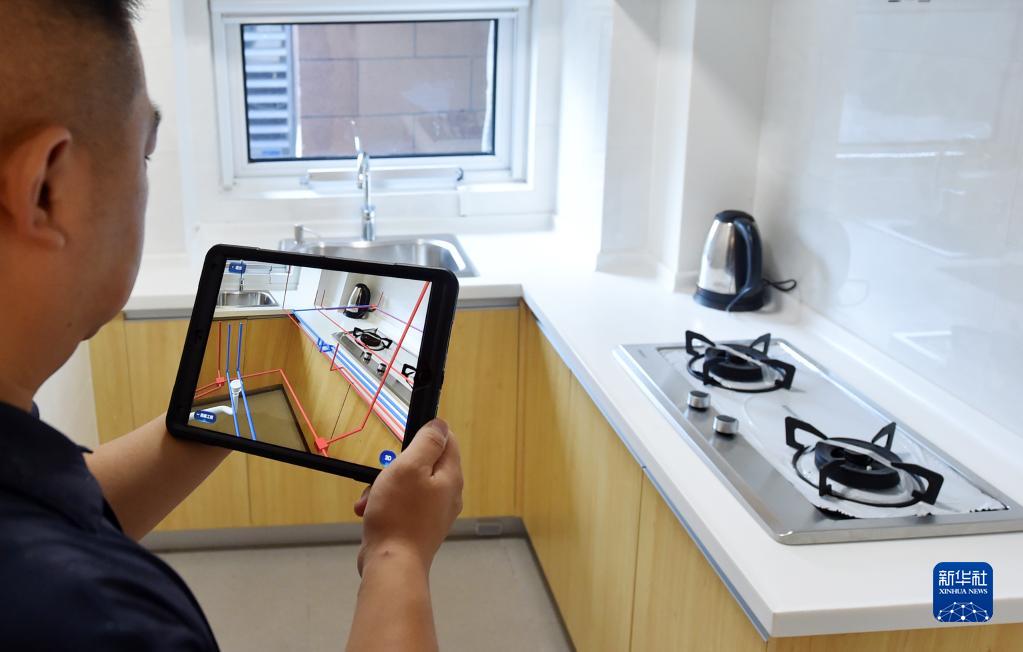 在中新天津生态城一小区,小区业主通过AR房屋使用说明书查看厨房管道线路(2020年8月13日摄)。