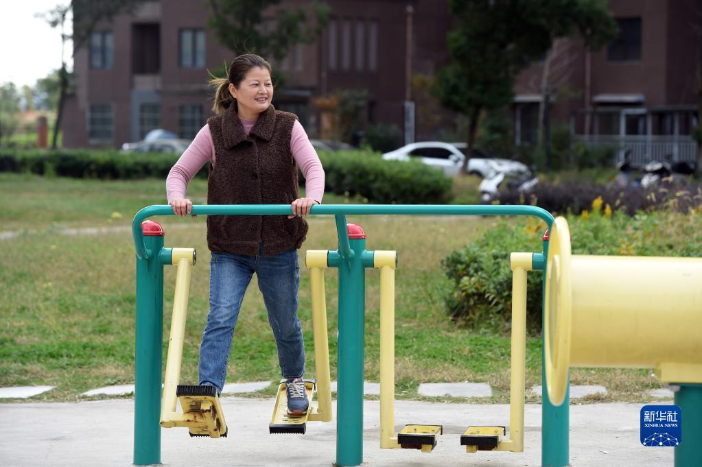 安徽省马鞍山市薛家洼的上岸渔民陈兰香在新家所在的小区里锻炼(2020年10月31日摄)。