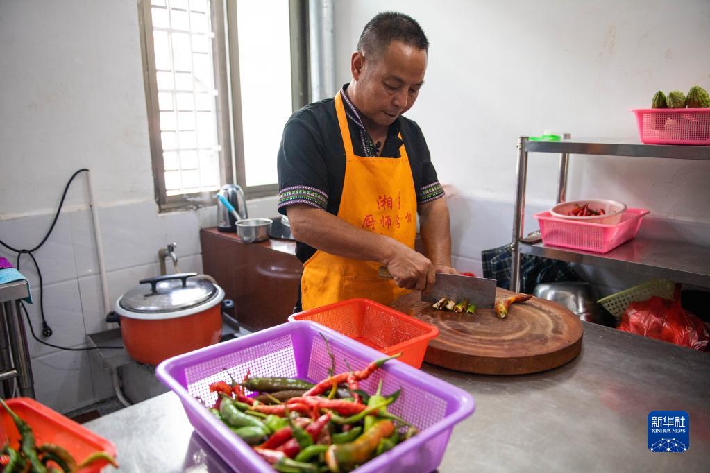 2020年9月17日,在汝城县沙洲瑶族村,朱小红在自家开的农家乐厨房里切菜。