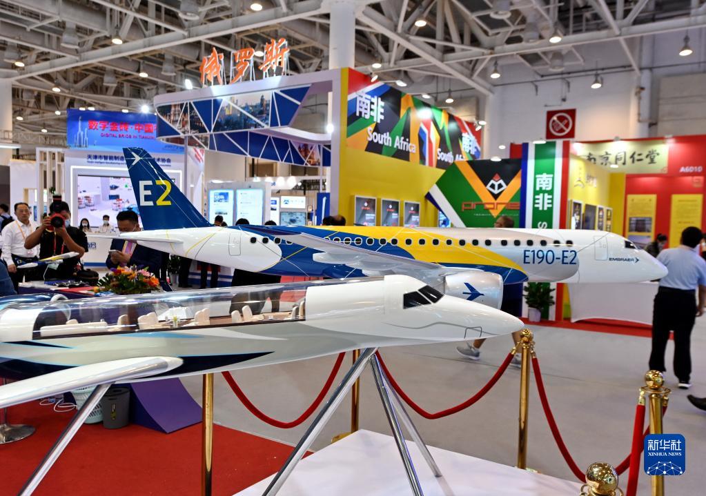 参观者从2021金砖国家新工业革命展展出的飞机模型前走过(2021年9月8日摄)。