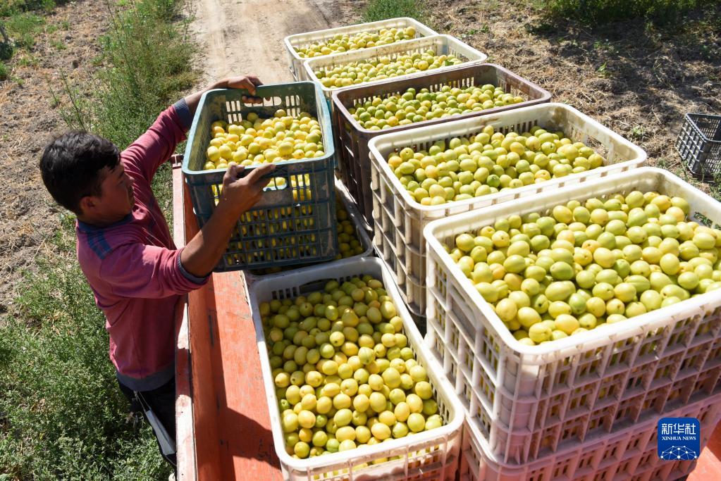 在新疆阿克苏地区库车市齐满镇齐满村,农户将采摘的小白杏装车(2021年7月1日摄)。