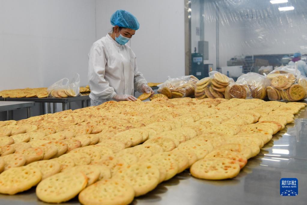 在新疆霍尔果斯馕产业园,工作人员在分拣刚做好的馕(2021年2月5日摄)。