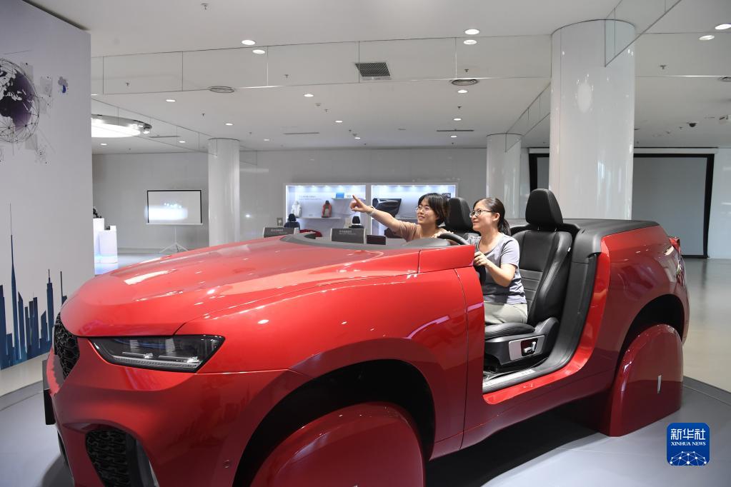 在河北保定市长城汽车哈弗技术中心,参观者在体验5G智能驾驶(2021年7月15日摄)。