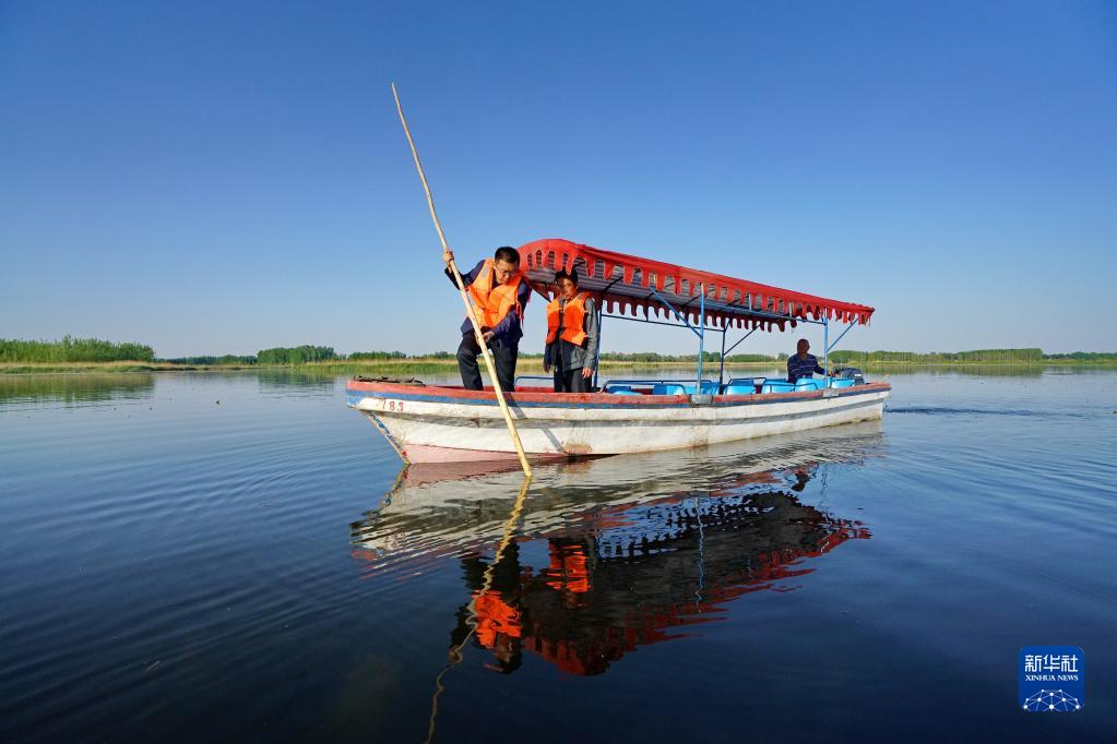 工作人员在白洋淀测量水位(2019年4月30日摄)。