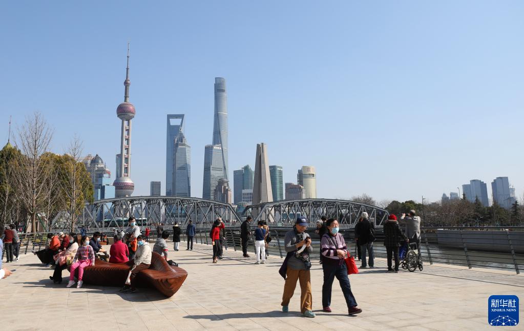 人们在上海苏州河边漫步休闲(2021年2月21日摄)。