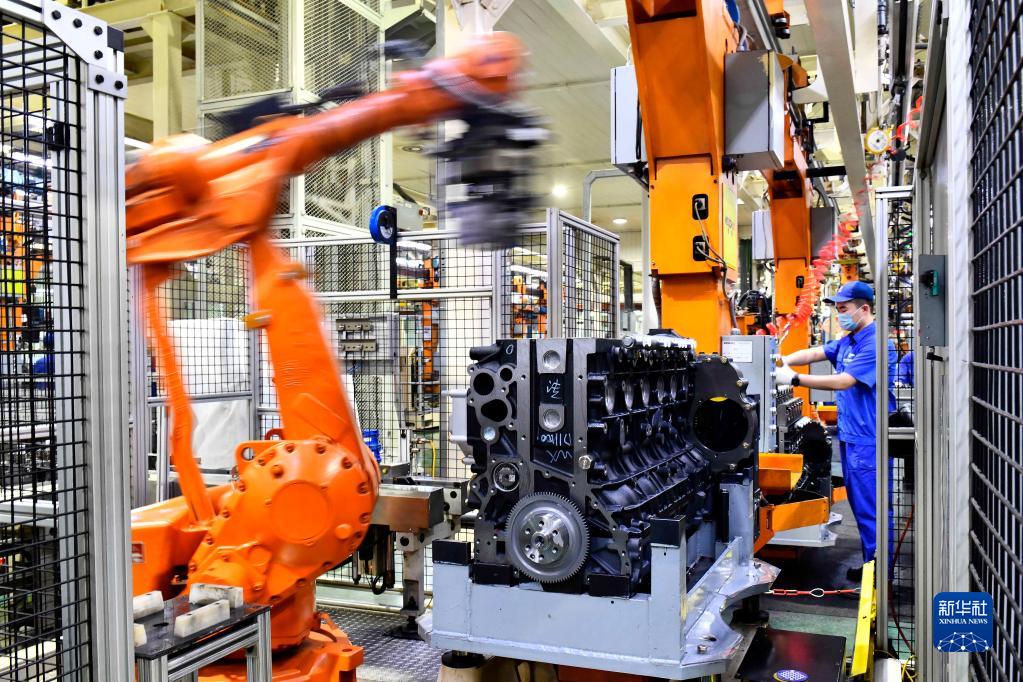 在位于山东潍坊的潍柴集团总装车间,机器人在流水线上装配发动机(2021年4月22日摄)。