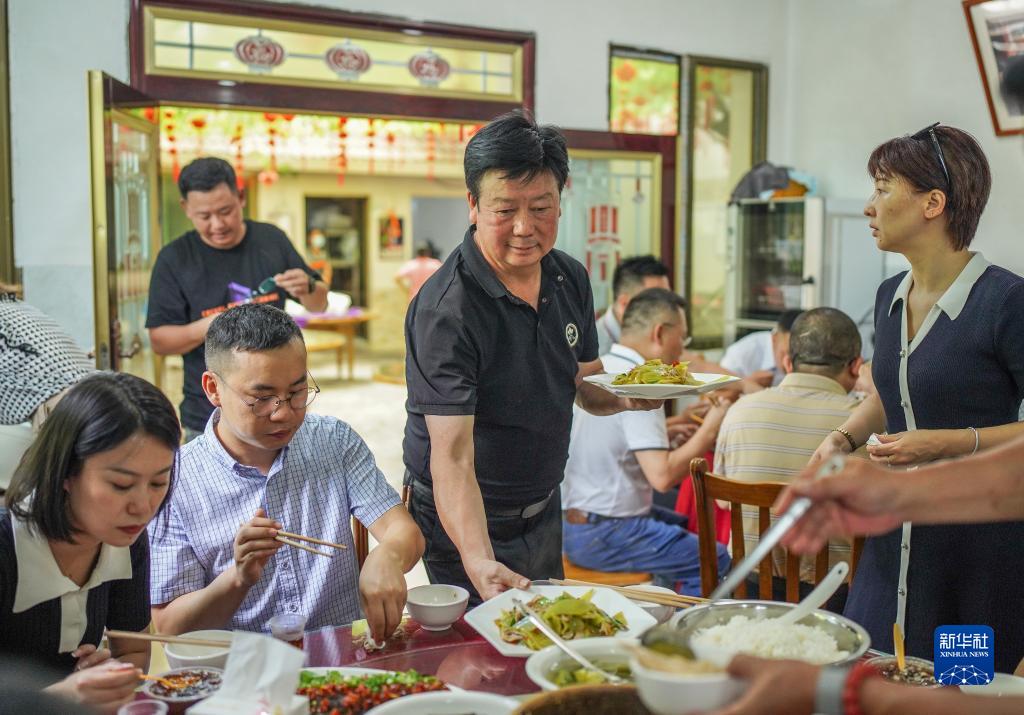 贵州省遵义市播州区枫香镇花茂村村民王治强为到农家乐就餐的游客上菜(2022年6月28日摄)。