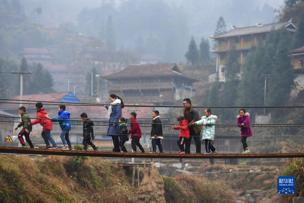 在位于广西融水苗族自治县和贵州省从江县交界的乌英苗寨,郑昌昊(右三)和妻子吴晗(左五)带着孩子们玩耍(2021年1月30日摄)。郑昌昊是广西柳州市委宣传部干部,曾于2020年4月至2021年5月在乌英苗寨担任驻村工作队队员,吴晗曾多次到乌英苗寨教学点支教。