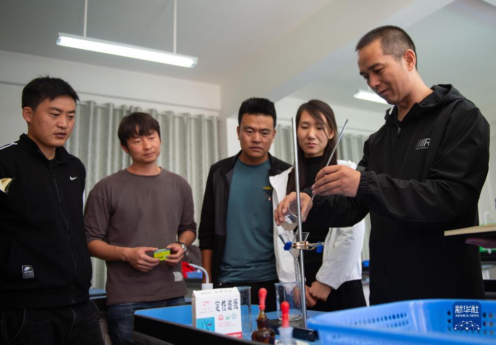 北京市援青支教教师、来自通州区陆辛庄学校的化学教师祁生贵(右一)在青海省玉树州第四民族高级中学指导学校教师进行实验教学(2020年8月12日摄)。