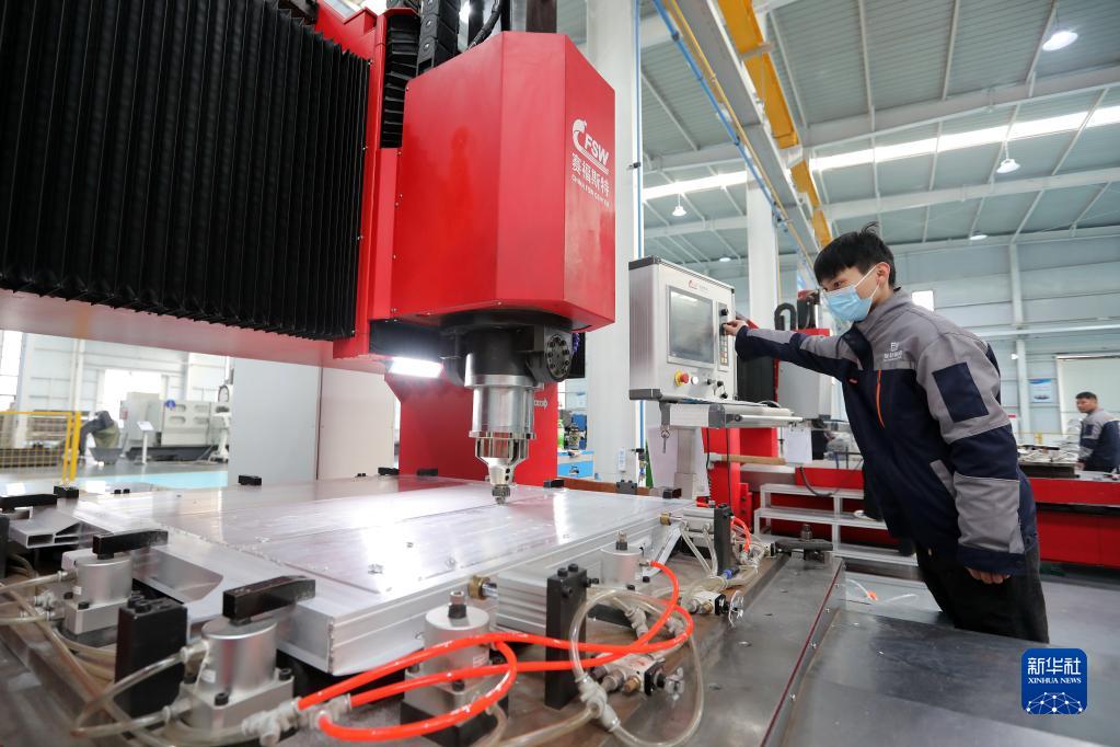 工人在安徽省淮北市一家陶铝汽车部件生产企业车间内作业(2021年12月23日摄)。