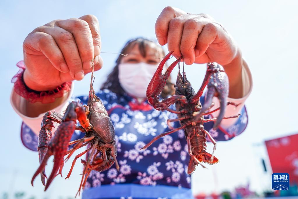 在江苏省淮安市盱眙县举行的第22届中国·盱眙国际龙虾节开捕仪式活动现场,农业工人展示小龙虾(2022年5月18日摄)。