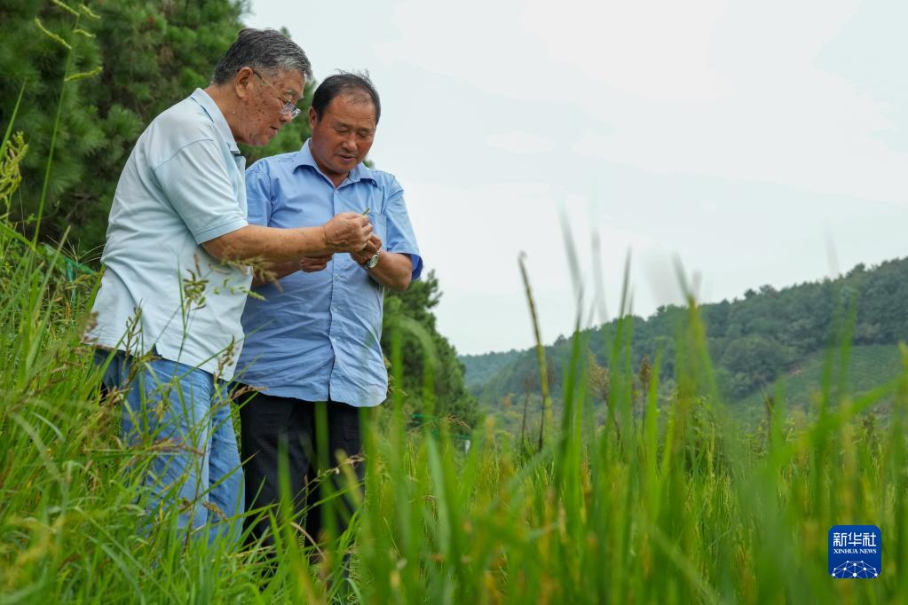 赵亚夫(左)在江苏省句容市天王镇戴庄村查看水稻长势(2022年9月9日摄)