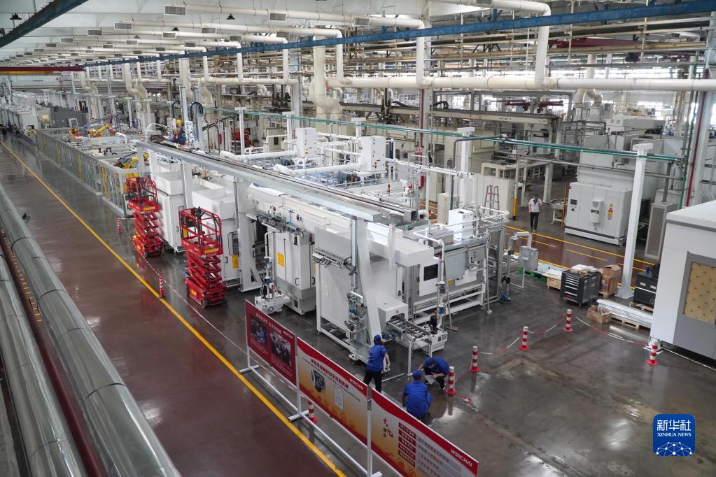 在山东省潍坊市,潍柴集团的工作人员在一条新的生产线上安装调试设备(9月19日摄)。