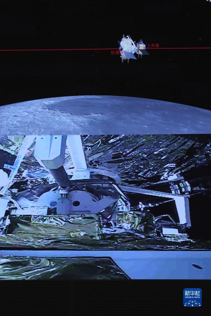 这是在北京航天飞行控制中心指挥大厅拍摄的嫦娥五号上升器与轨道器返回器组合体交会对接画面(2020年12月6日摄)。