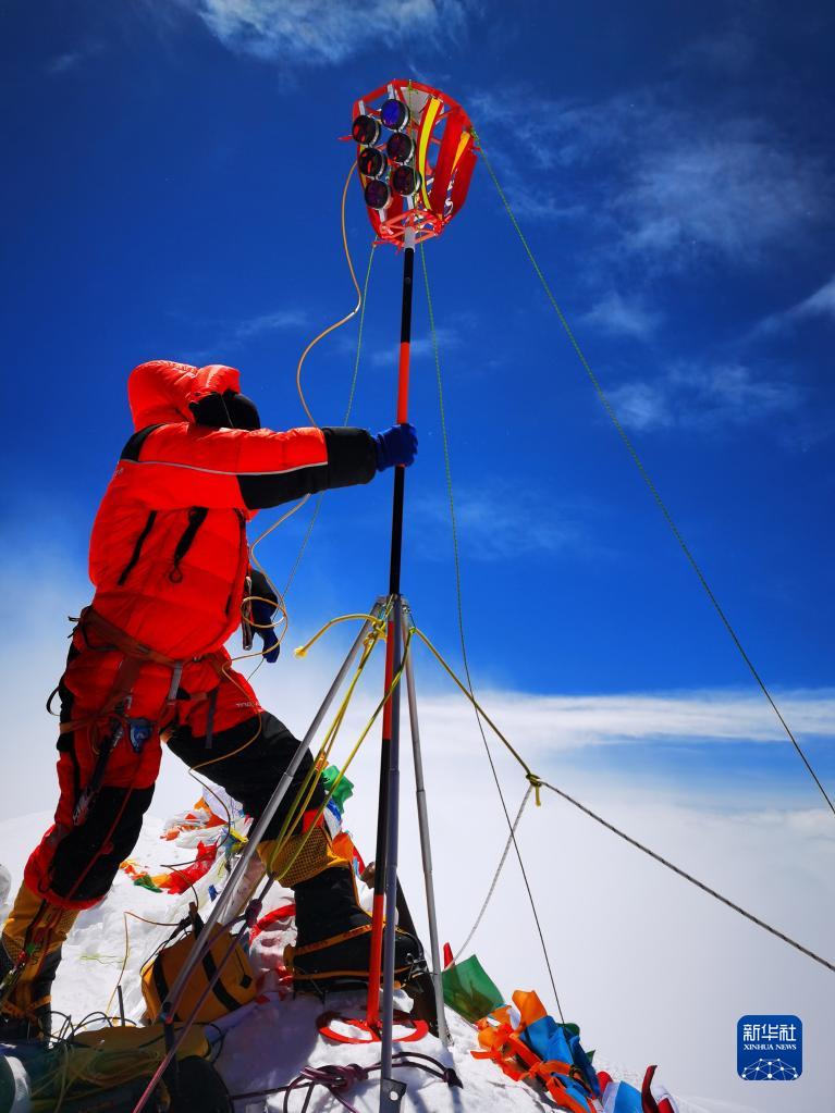 2020珠峰高程测量登山队队员在珠穆朗玛峰峰顶开展测量工作(2020年5月27日摄)。