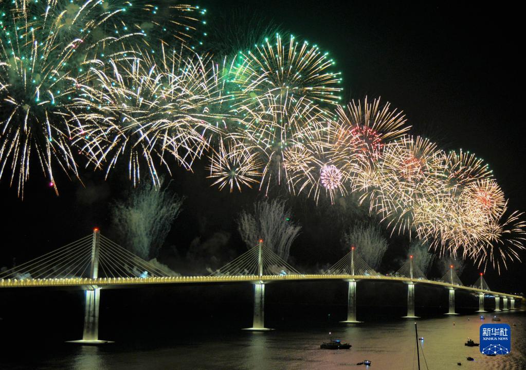 这是在克罗地亚科马尔纳拍摄的由中企承建的佩列沙茨大桥通车仪式上的焰火表演(2022年7月26日摄)。