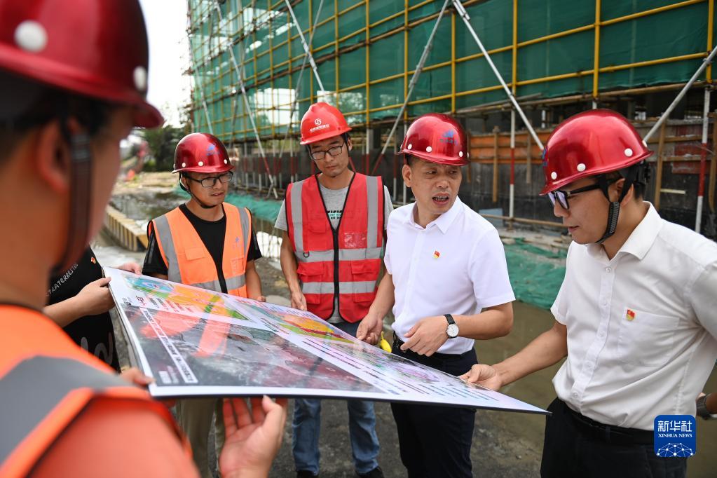 在浙江省宁波市奉化区萧王庙街道滕头村,二十大代表、滕头村党委书记、村委会主任傅平均(右二)在村党群服务中心大楼建设工地察看施工进展(2022年9月16日摄)。