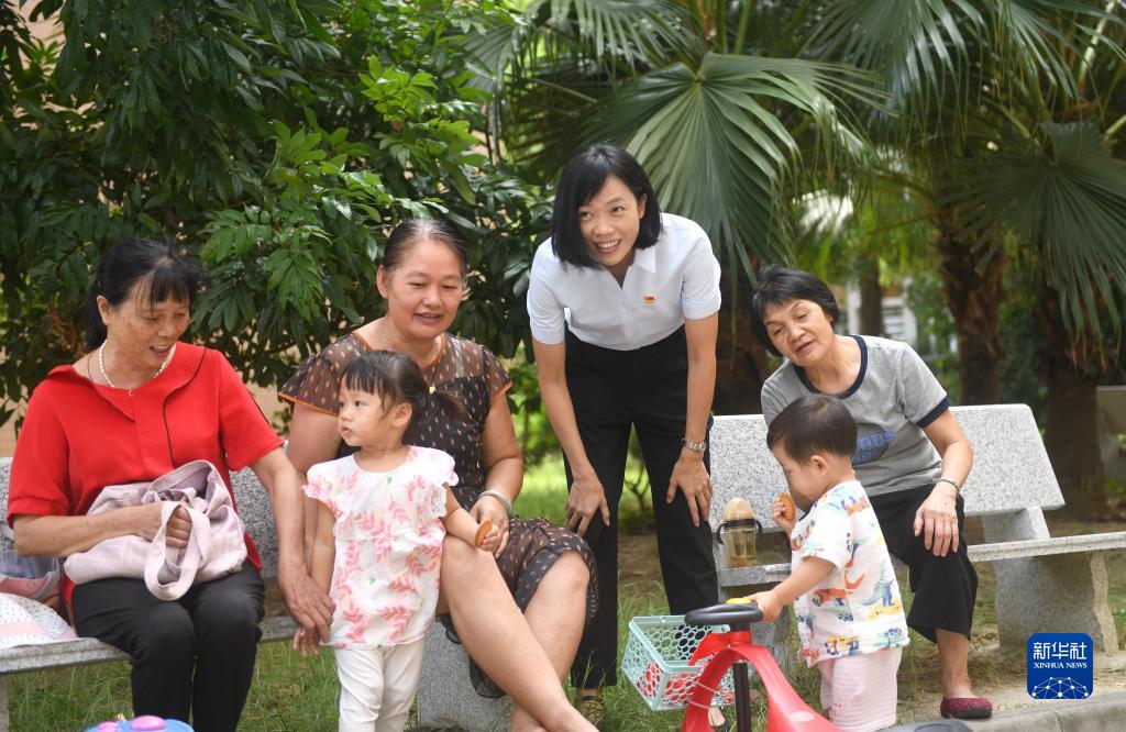 二十大代表、广东省佛山市禅城区古灶村党委书记、村委会主任陆秀兴(右三)和村民在一起聊天(2022年9月7日摄)。