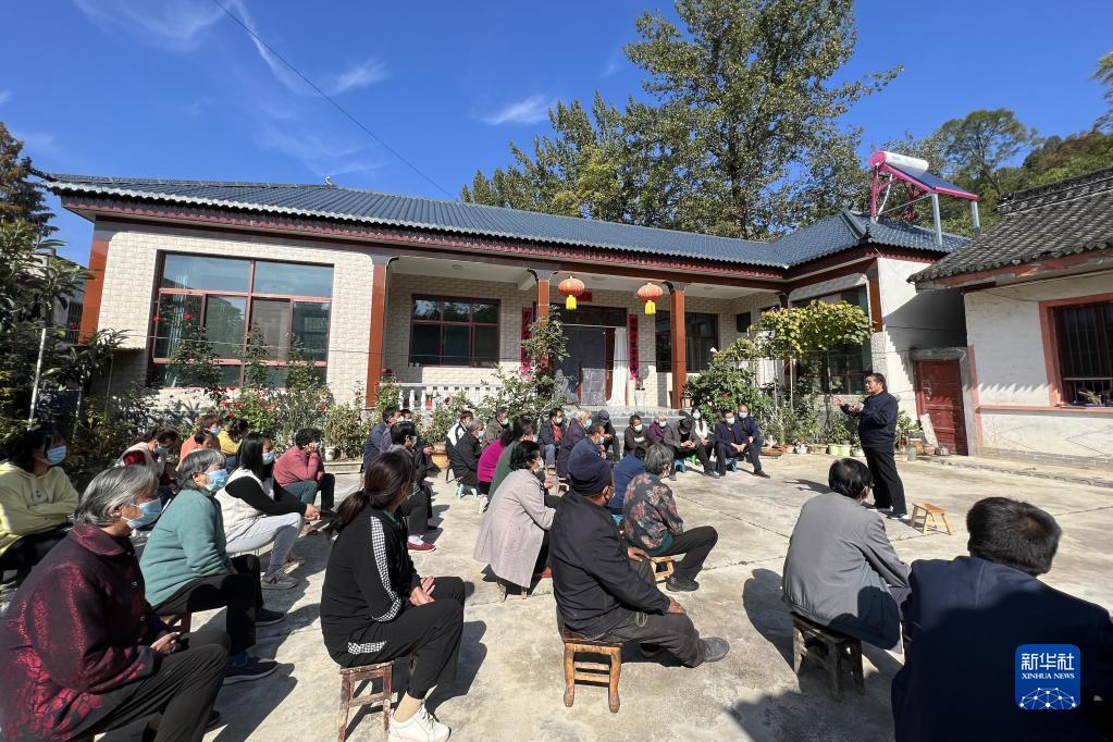 11月18日,在甘肃省陇南市成县店村镇卯堡村,驻村干部通过“农家板凳会”的形式开展党的二十大精神宣讲。