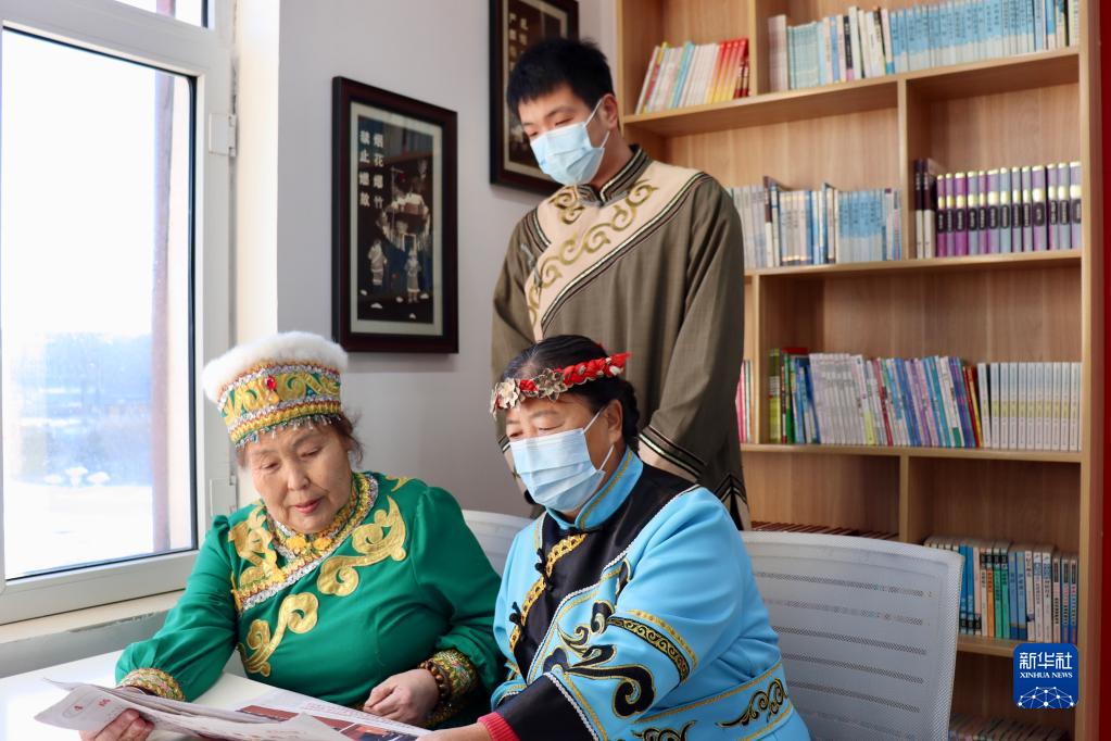 12月11日,在黑龙江省同江市八岔赫哲族乡八岔村的伊玛堪传习所内,宣讲人吴桂凤(左)身着赫哲族服装,向村民宣讲党的二十大精神。