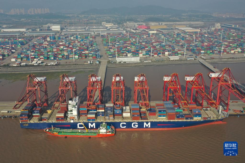 货轮停靠在浙江宁波舟山港梅东码头(12月13日摄,无人机照片)。