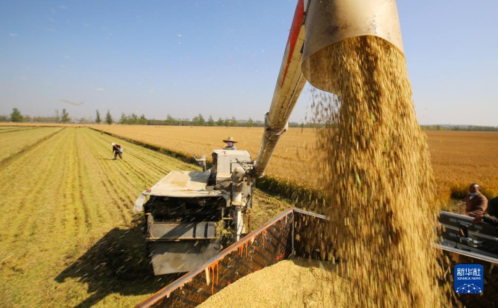 10月23日,在山东省临沂市郯城县郯城街道,农民将收获的水稻装车。