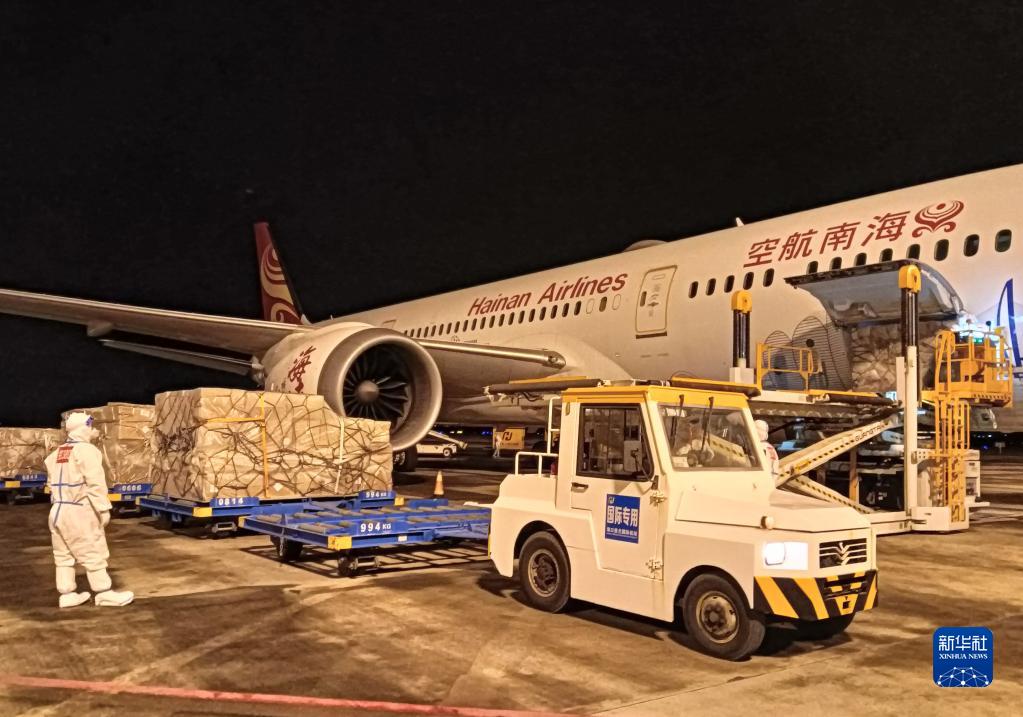 11月24日,海口美兰国际机场的工作人员在停机坪装运货物。次日凌晨,海口—法兰克福客改货定期洲际航线正式恢复。