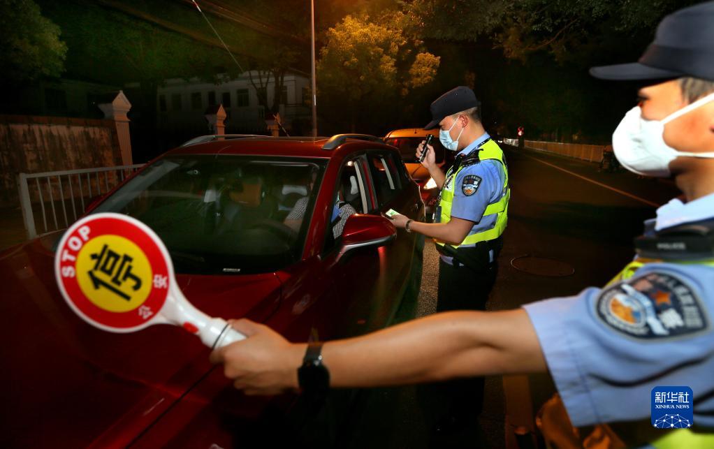 上海市公安局闵行分局梅陇派出所民警在夏夜治安巡查宣防集中统一行动中检查司机证件(2022年7月23日摄)。