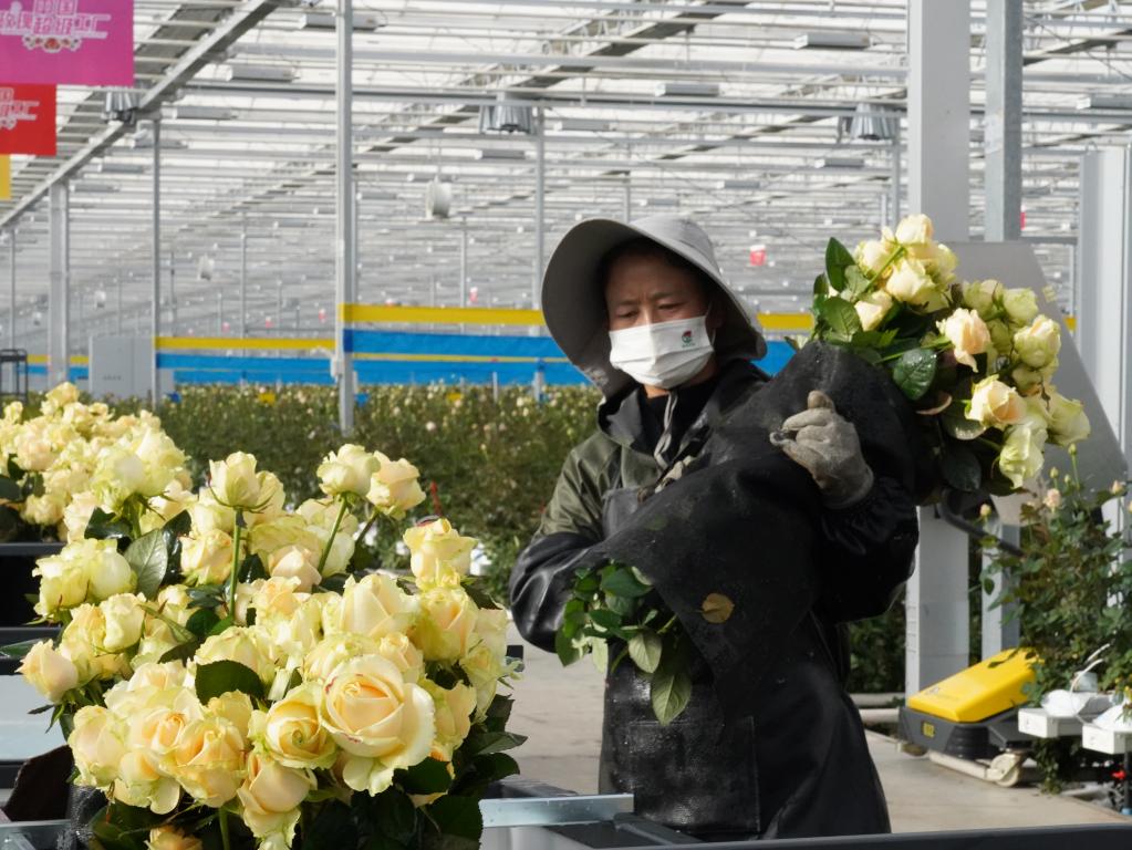 春节临近,位于甘肃省临夏回族自治州临夏市枹罕镇的高新花卉特色产业示范园区里暖如三春,园区内的临夏百益亿农国际鲜花港内,3个6万多平方米全自动智能温室里不同品种的玫瑰花争着盛开。采摘、保鲜、剪切、包装各环节上的几百名女工们忙个不停。