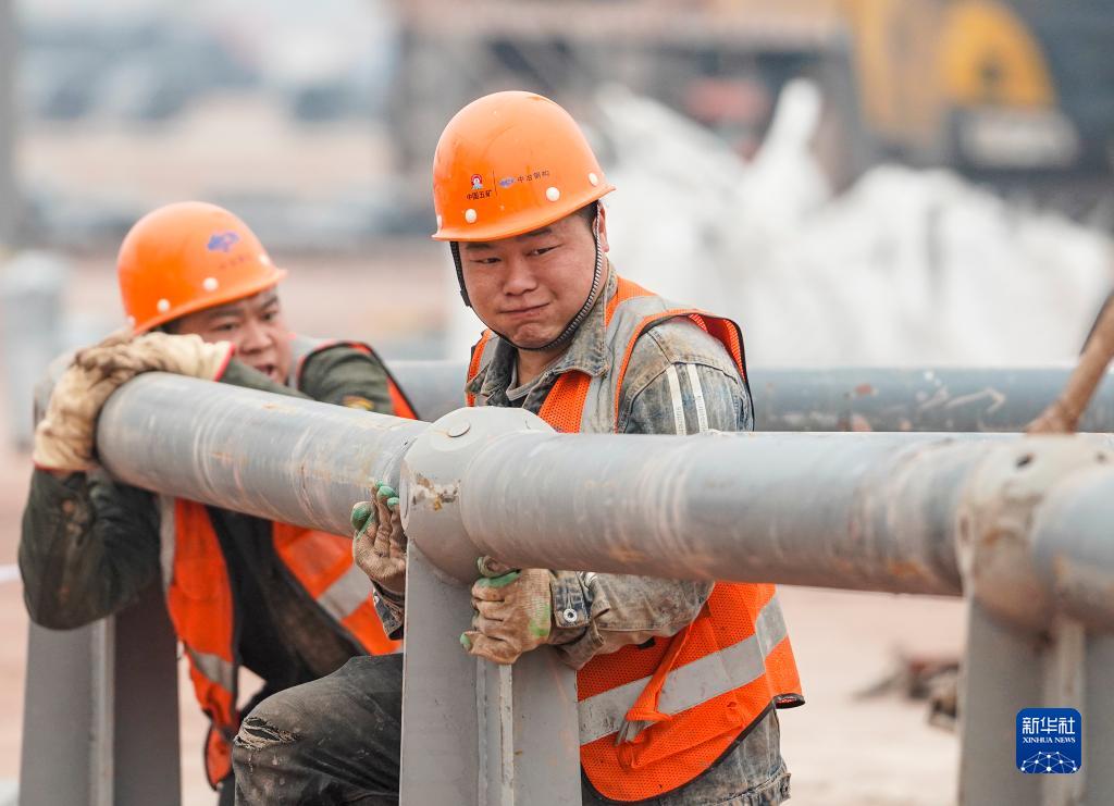 工人在重庆两江新区新能源汽车产业园基础设施配套项目现场进行钢结构材料拼装作业(1月23日摄)。
