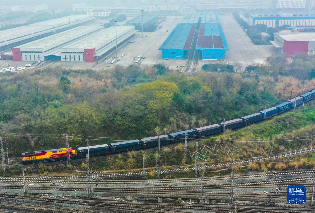 1月22日,农历新年首趟西部陆海新通道铁海联运班列从重庆团结村中心站发车(无人机照片)。
