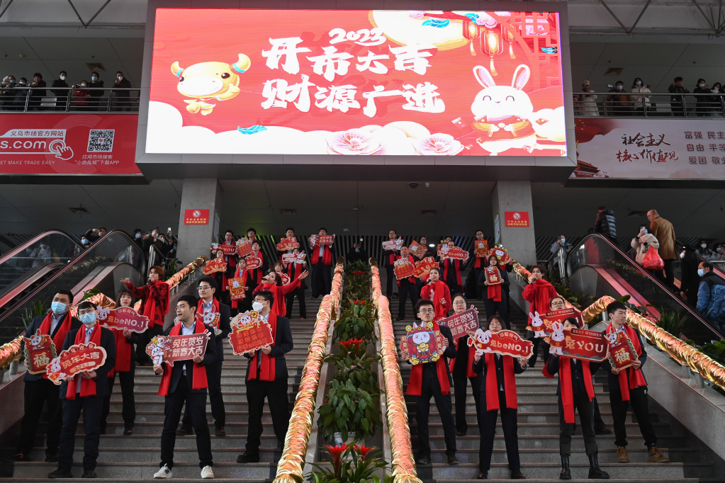 这是被称为“世界超市”的义乌中国小商品城在中国疫情防控进入新阶段后的首个市场开市日。记者看到各区商户贴春联、挂花灯、上新品,面貌一新迎开市,而操着不同口音的采购商,往来于各家商户,他们抱着同样的想法——抢商机、谈合作。
