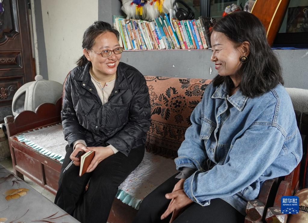 在西藏墨脱县德兴乡德兴村,白玛曲珍(左)在村民格桑曲珍家了解手工艺品制作和销路情况(2月19日摄)。