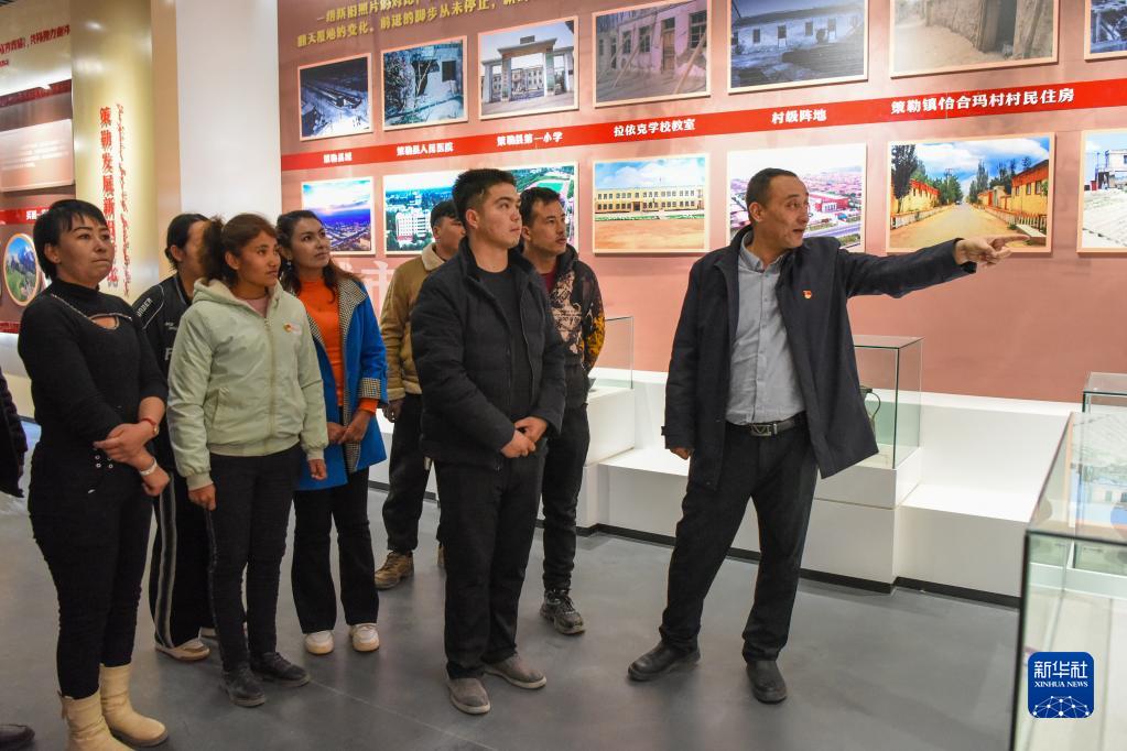 2月20日,在新疆和田地区策勒县巴什玉吉买村的民族团结馆,买买提依布热依木·买买提明(右一)向村里的年轻人介绍策勒县的变化。