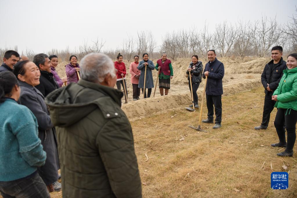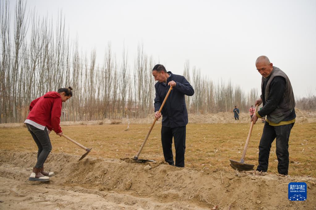 2月20日,在新疆和田地区策勒县巴什玉吉买村,买买提依布热依木·买买提明(中)和村民一起整理土地,为春耕生产做准备。