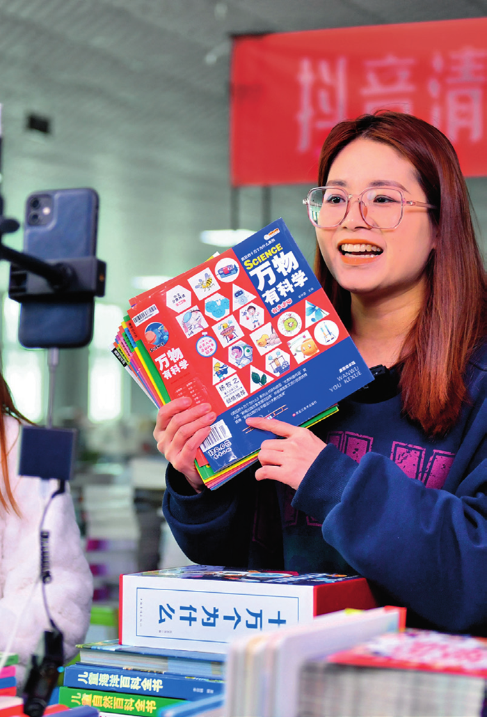 廊坊市永清经济开发区京联集团馆配图书联合现采基地,工作人员在电商平台直播销售图书(2023年3月26日摄)。骆学峰摄/本刊